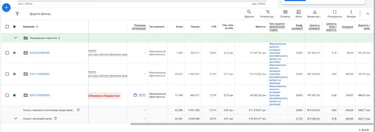 Сегментація кампаній: основний продаж + нові аудиторії + тестування.