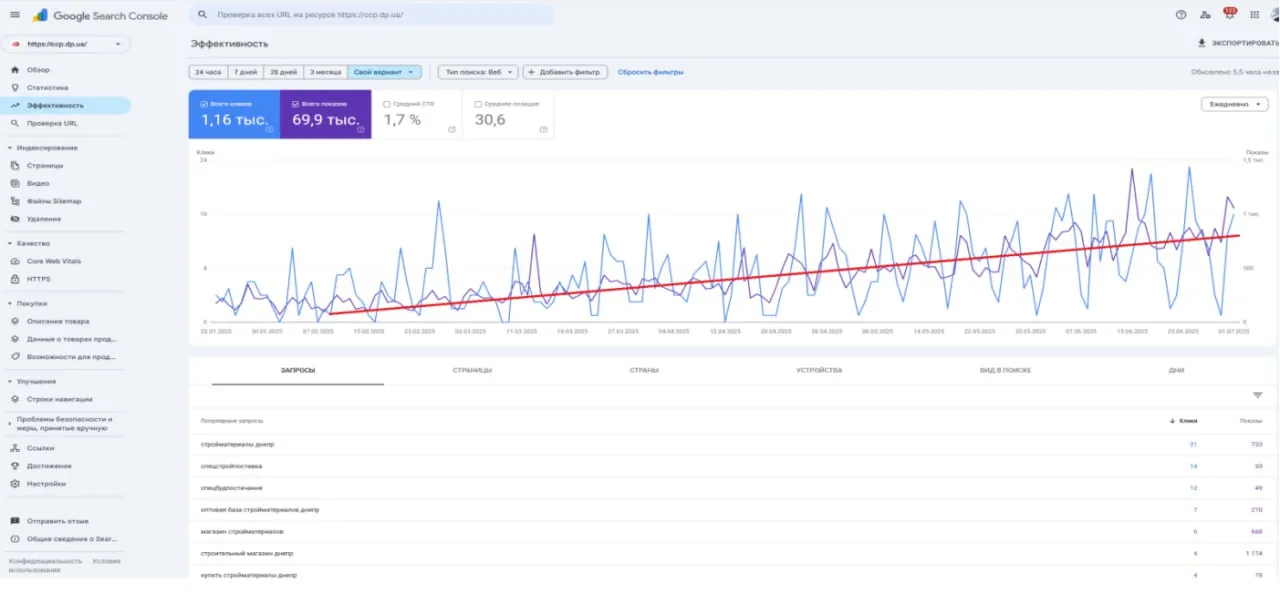Вивести ключові категорії у ТОП-10, охопити запити по будматеріалах, масштабувати органічний трафік і посилити регіональну присутність у Дніпрі. Сформувати стабільний SEO-канал продажів для оптових покупців.